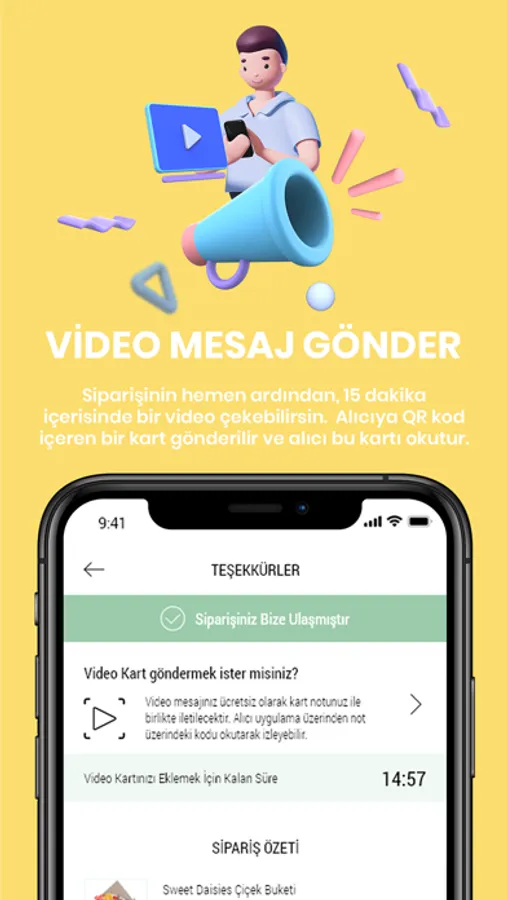 Yeni uygulamamız sayesinde oluşturduğunuz siparişleri daha özel kılmak için isterseniz video kart mesajı hazırlayabilir, kendi cümlelerinizle sevdiklerinize ne kadar özel olduklarını hissettirebilirsiniz.