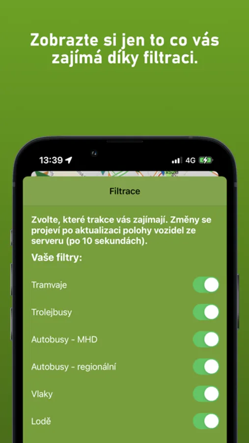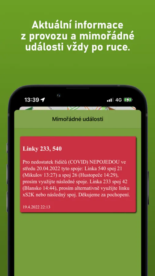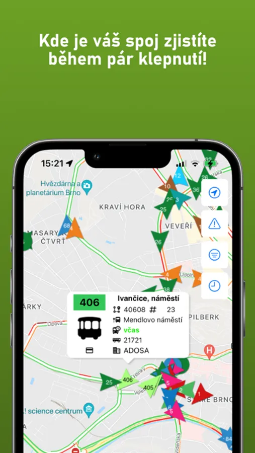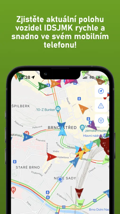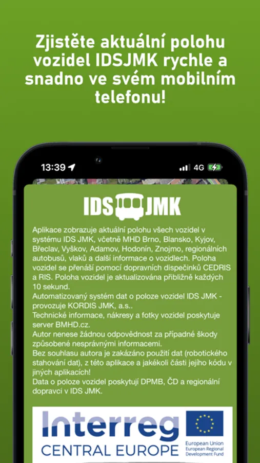 Aplikace zobrazuje aktuální polohu všech vozidel a aktuální odjezdy v systému IDS JMK, včetně MHD Brno, Blansko, Kyjov, Břeclav, Vyškov, Adamov, Hodonín, Znojmo, regionálních autobusů, vlaků a další informace o dopravě (např. výluky, mimořádné události).