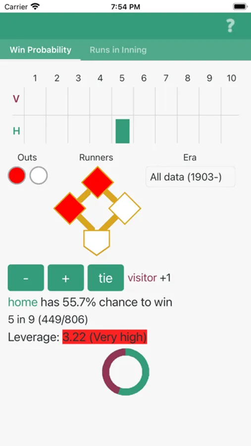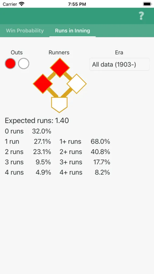 Find the probability your team will win from a given situation! Also see how likely your team is to score in an inning.