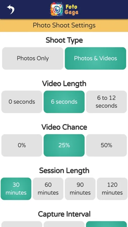 Foto Gaga is quite flexible. You can select from various photo shoot settings to customize the memories you capture. Choose photo shoot length, the interval between photos, if photos and videos should be captured, how long video clips should be, how often a video clip should be captured, if photos and videos should be zoomed and the chance of zooming, and more. And, all of your photo shoots are stored only on your phone or tablet and you have the ability to password protect the ones you'd like to keep private.