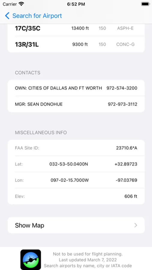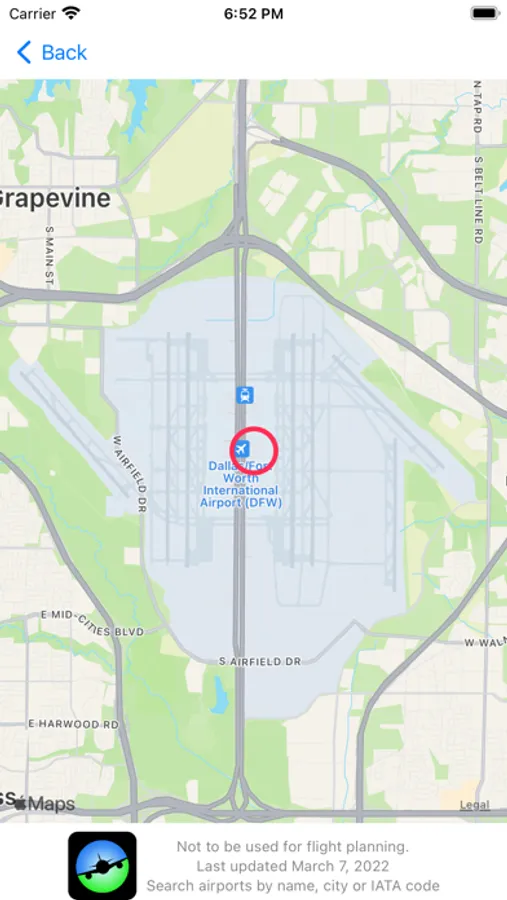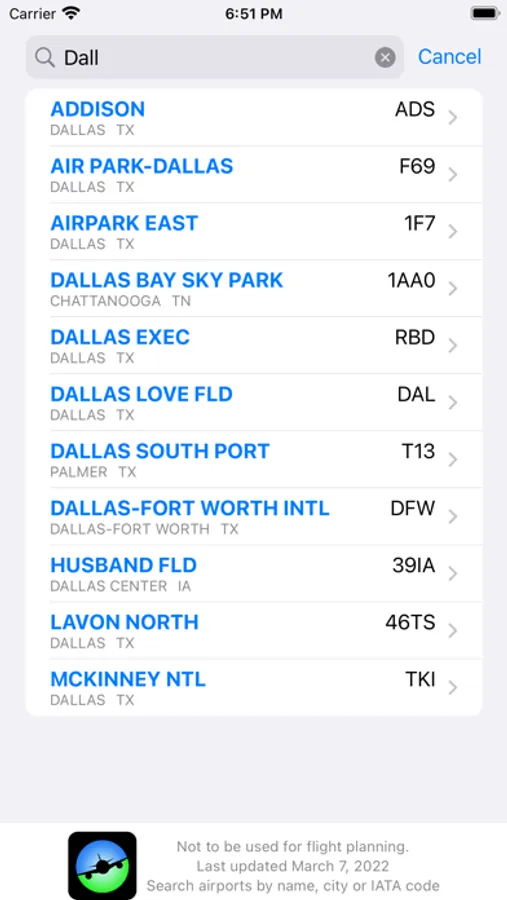 U.S. Airports Db (database) is a handy app for quickly searching through more than 13,000 U.S. land airports. One can easily locate any airport with just a few keystrokes. Using a single search entry, airports are found using name, city or IATA identifier. It's intuitive and quick.