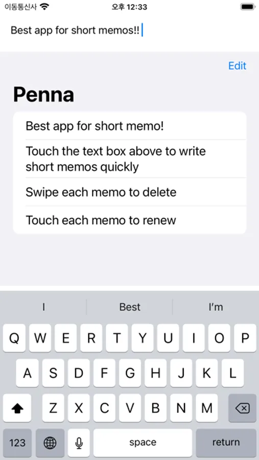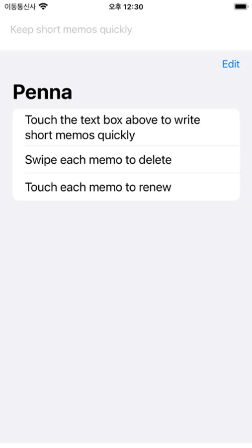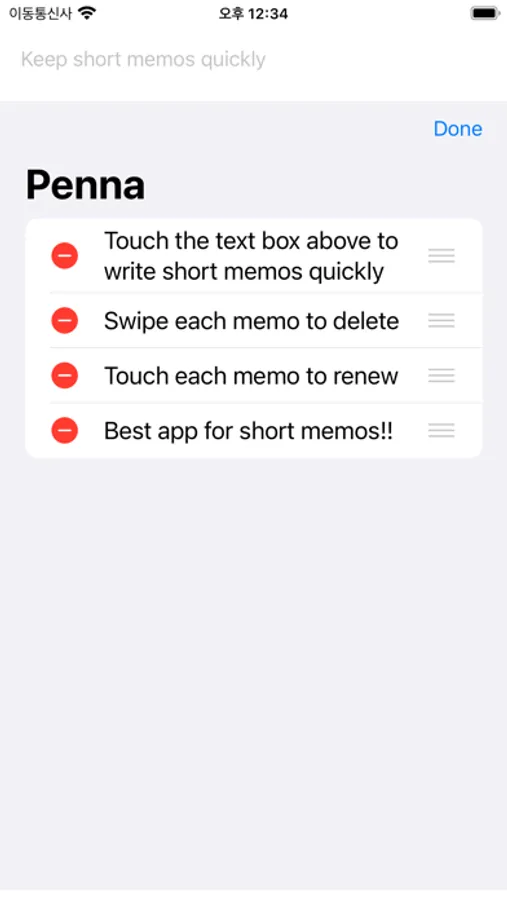 Penna is super small app to keep short text memo quickly. Use Penna to write some key words that suddenly hit your brain! Never forget your ideas!