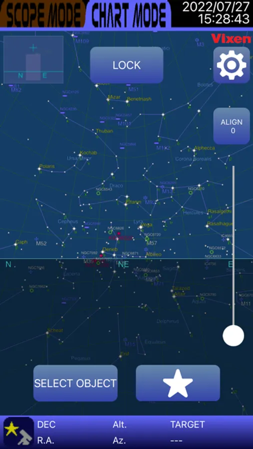 In this mode, you can select the celestial objects you want to introduce into your telescope from the star charts on the screen. You can choose a named celestial object seen inner the center green circle or bring a field of view of the telescope to the center of the star chart.
