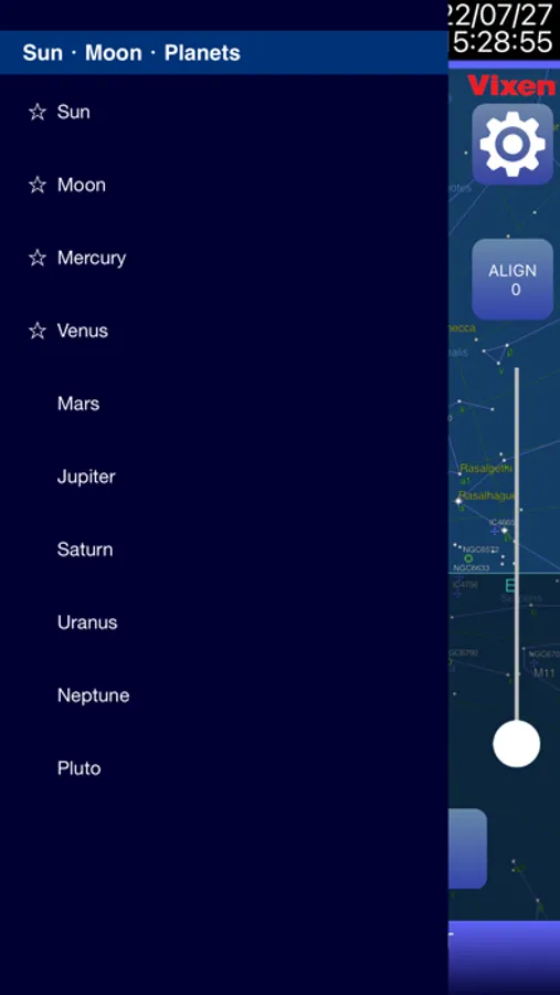 After introducing the target celestial object in the center, you can match the direction of the telescope's field of view to that celestial object by tapping "ALIGN" for alignment. You can view and delete alignment logs by pressing "ALIGN" a little longer.