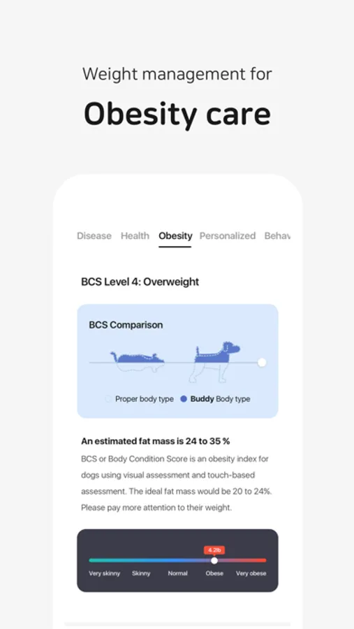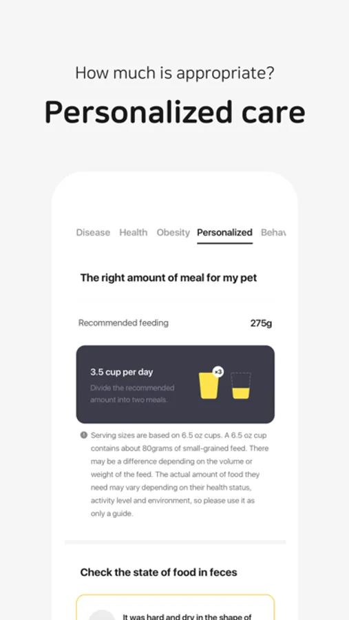 • Check recommended calorie intake, feed amount, and diet management method suitable for your companion animal’s weight and age.