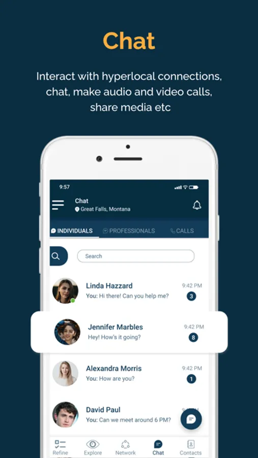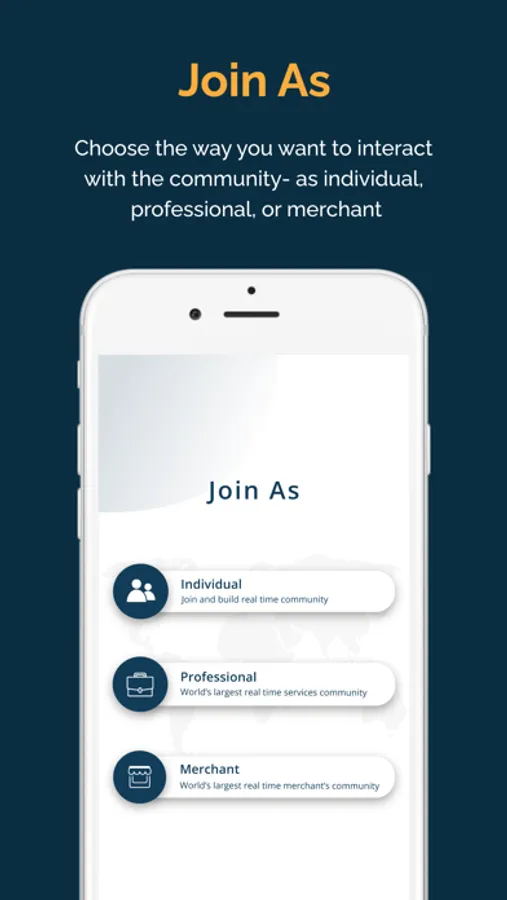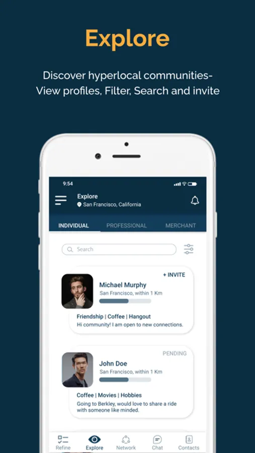 Individual category members can network with unconnected users around them, professional category users can sell their services to other unconnected users, and Merchant category users can broadcast their profile and media and can sell their goods to the hyperlocal community