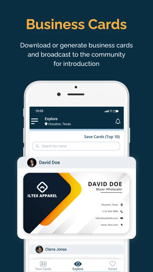 Users can Generate or Upload their business cards and broadcast them in the hyperlocal. Users searching for the business can view your cards, save the cards in folders on the app, contact users, chat, call, etc.