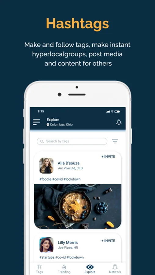 Users can create Hashtags groups for their own purpose and can share audio, video, pics, docs, etc for the other hyperlocal users to see. Other users can follow your tags, like your posts, share and comment on your posts and can make hyperlocal open groups for the communities.