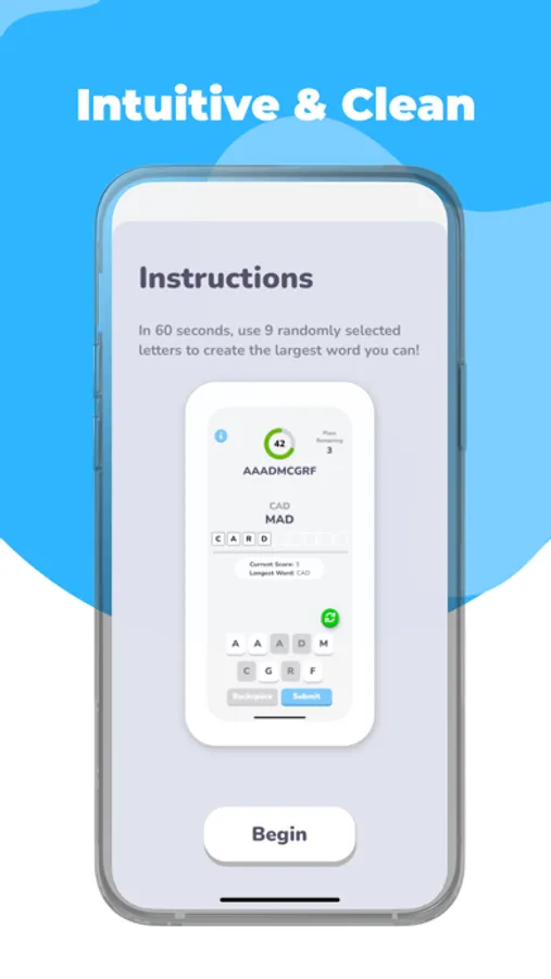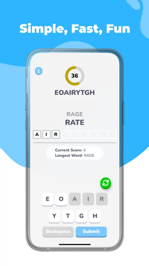 MinuteBeat Words is a simple FREE anagram word game that challenges players to create the longest word possible in 60 seconds from 9 random letters. Unlike other word games, MinuteBeat is simple and does not give extra points for using certain letters. The only objective is to craft the longest possible word! Finally making educational vocabulary word anagram puzzles exciting and simple. MinuteBeat is a fun, challenging, and exciting way to test and train your brain! Great for students to practice anagrams, spelling, and vocabulary or for word puzzle lovers!