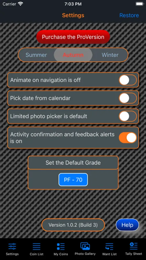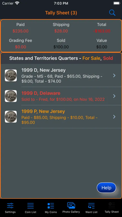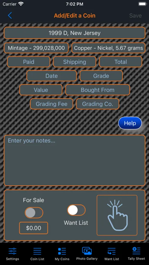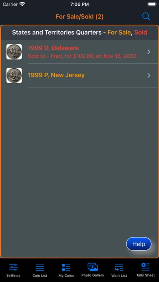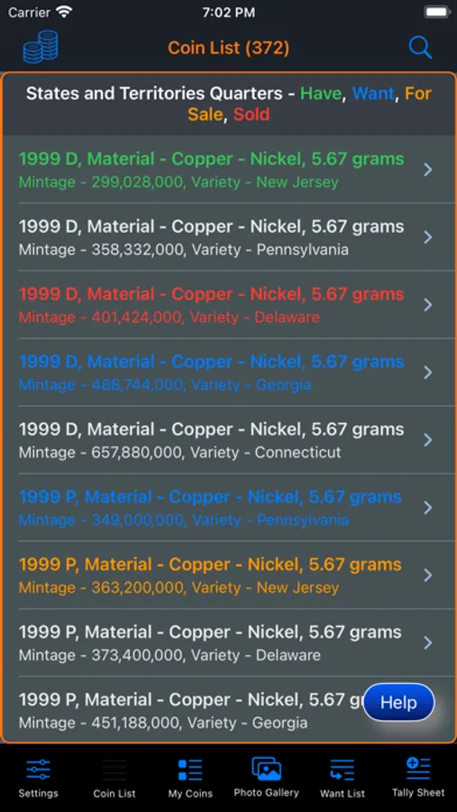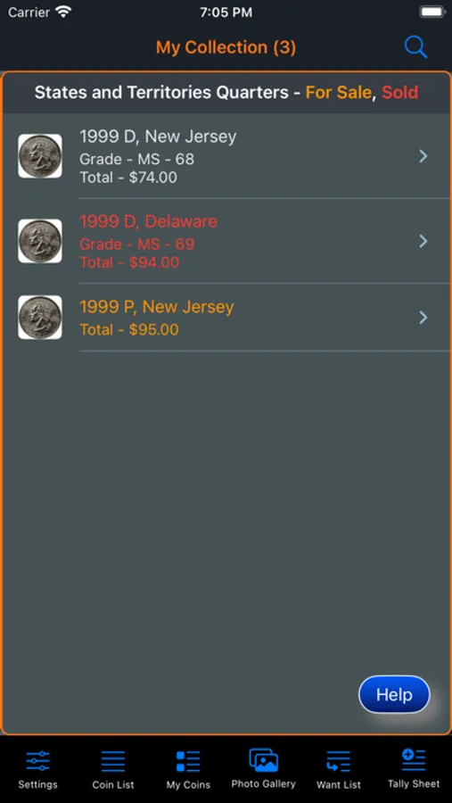 This app will provide the ability for the user to organize, track and manage their collection of coins. Images of each coin can be included with the collection. There is also a means within the app for the user to peruse all of the images in an entertaining manner. The app has three (3) color themes which help to make the app more enjoyable. A running tally of the cost for the entire collection is provided. A want list is also included in the app to allow you to ear-mark coins that you are searching for.