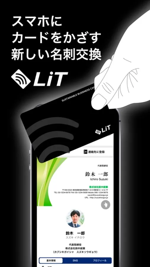 ・スマホにLiTカードをかざすだけで、相手の情報を瞬時にアプリへ登録。