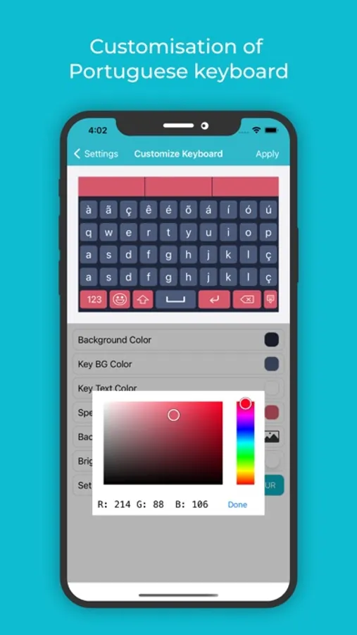 • Change colours for the Background colour, Key background colour, Keyboard text colour, Suggestion box colour etc, so that typing does not seem boring and monotonous with this Portuguese keyboard for iOS.