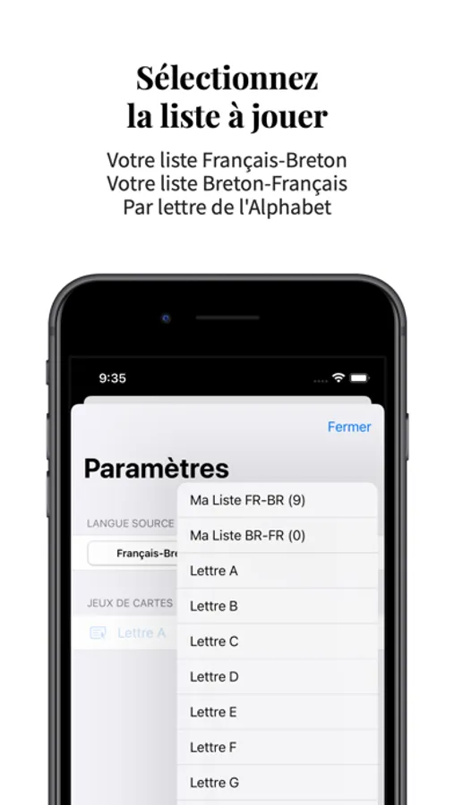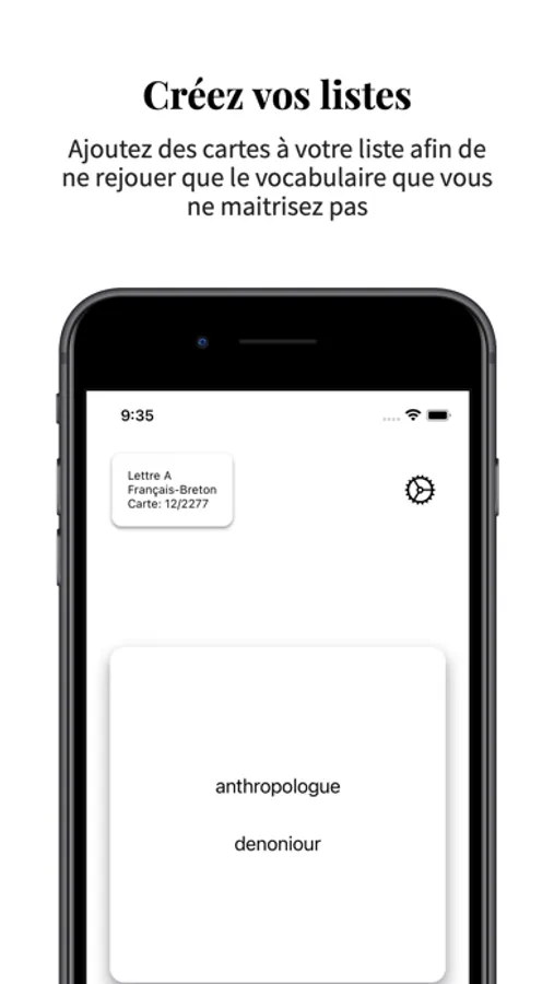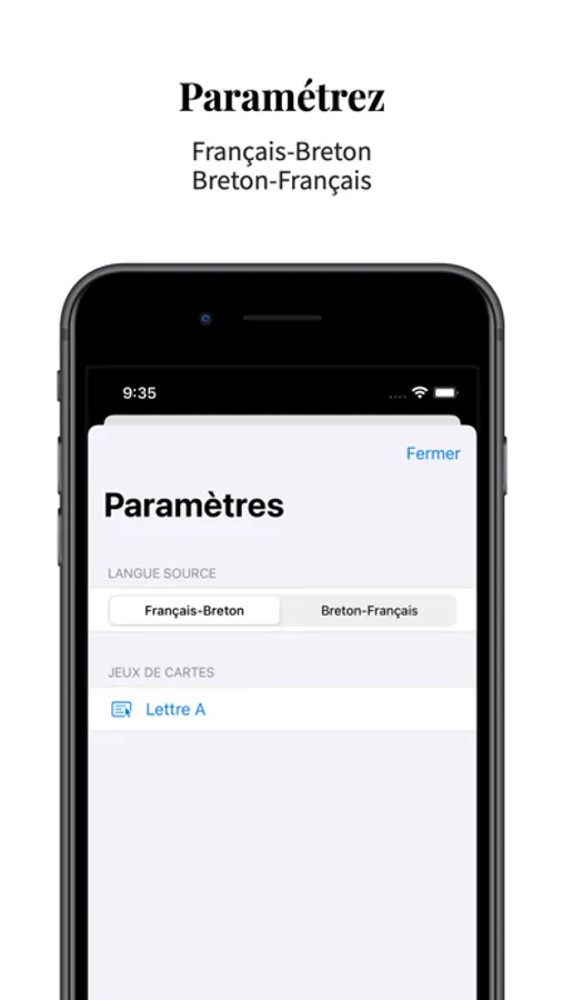 Cette application vous pemettra d’apprendre ou de réviser le vocabulaire BRETON en feuilletant des cartes de vocabulaire (“flash-cards”). Essayez de deviner la traduction du mot ou de l’expression présenté, puis, un tap sur la carte et la traduction apparait en dessous aussitôt. Une méthode agréable et efficace pour apprendre des mots et expressions en breton à son rythme. Un balayage (swipe) à droite ou à gauche vous permettra de passer à la carte suivante.