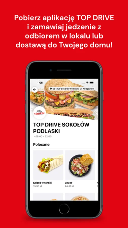 Pobierz aplikację już teraz i przyspiesz czas spotkania ze swoimi ulubionymi potrawami serwowanymi w restauracjach szybkiej obsługi Top Drive. Dziś, dzięki aplikacji, szybko i łatwo znajdą się u Ciebie w domu.