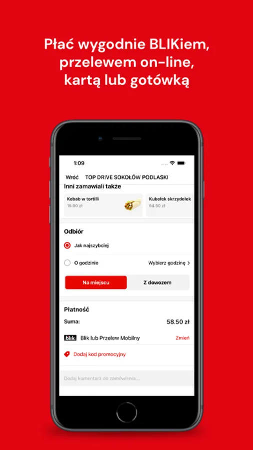 - możliwość płatności online za dokonywane zamówienie (Blik, przelew) lub wybór płatności przy odbiorze zamówienia;