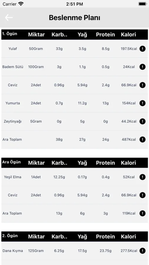 Beslenme programi kapsamında öğünler ve öğünleri oluşturan ögelerin makro ve mikro değerleri gösterilmiştir...