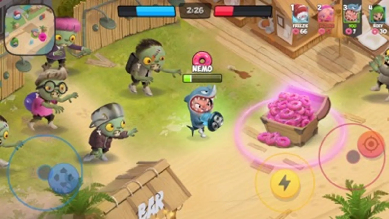 • Play real-time PvP and PvE battles with friends. Crush zombies, collect donuts and defeat opponents with cunning. Watch out—they want to take your trophies!
