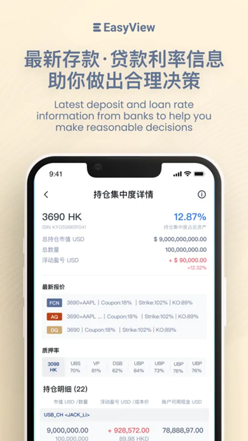 EasyViewPro 是EasyView自主研发的一站式数字化金融资产组合管理平台,通过EasyViewPro APP,可进行投前、投中、投后的全流程管理。搭建以超高净值客户、外部资产管理人和家族办公室为核心的投资生态,提供即时互动、私人银行户口资产查看、结构化产品询价和存续管理等多元服务,全面满足金融机构及其客户在私人财富管理方面的需求。