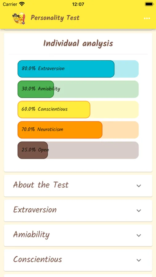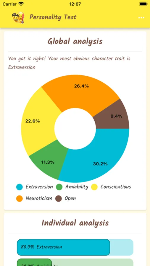 Personality is a set of patterns of behavior and attitudes that are typical of each person and that tend to remain stable and predictable. One of the most widespread tests to describe personality is the Big Five Model. It is a test with worldwide and cross-sectional evidence for the most different contexts. Through a questionnaire with 50 questions, it is possible to evaluate the scores in the 5 factors: Extroversion, neuroticism, kindness, conscientious and openness. These scores will help you get to know yourself and understand yourself better. Try it, good test!