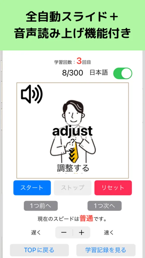・自動スライド機能+音声読み上げ機能付きだから、普通の単語帳よりも3倍も効率よく記憶。