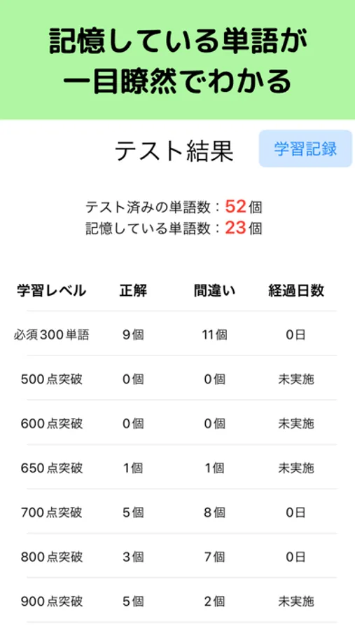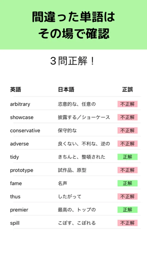 ・単語テストで記憶力を強化。間違ったものだけ効率よく学習。