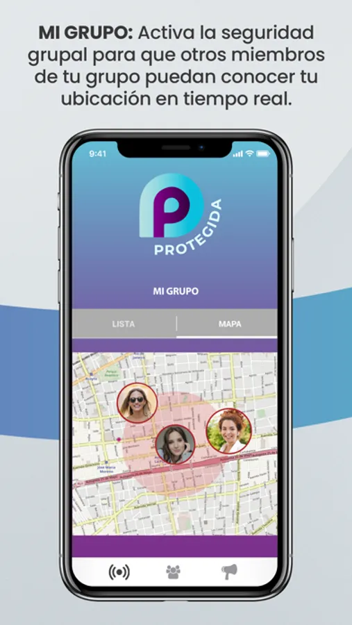 La App Protegida también dispone de un MAPA que permite conocer el ENTORNO donde se encuentra la usuaria, permitiendo a ella y otras usuarias de Protegida reportar sitios peligrosos y realizar distintas denuncias anónimas que quedan ubicadas en el MAPA. De esta forma Protegida se convierte en una RED de PROTECCIÓN para ella y toda su comunidad, pudiendo ser advertida a tiempo y también advertir a las demás usuarios ante diversos peligros en su cercanía.