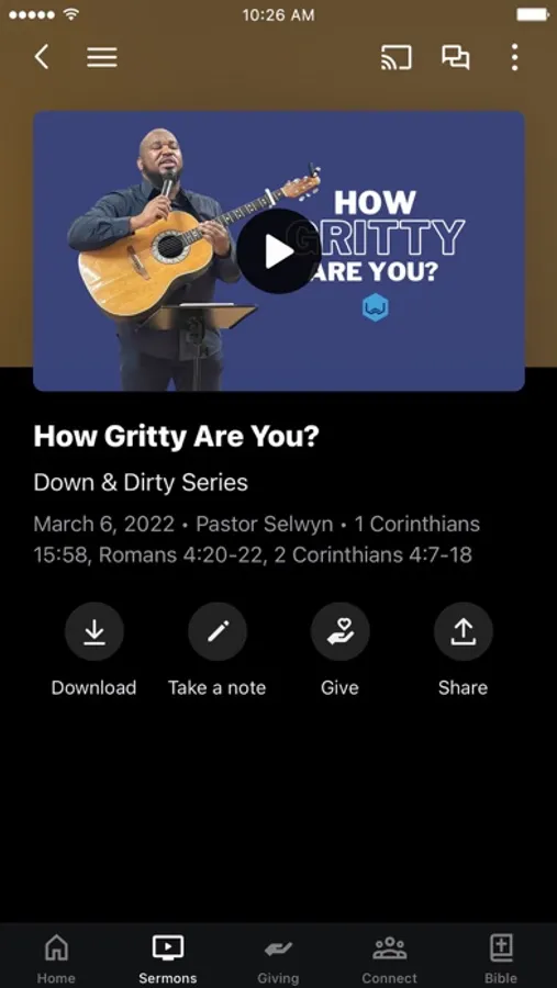 This app will help you stay connected with the day-to-day life of our church. With this app you can: watch or listen to past messages; stay up to date with push notifications; share your favorite messages via Twitter, Facebook, or email; and download messages for offline listening.