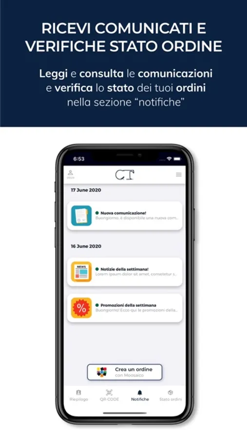 Grazie alle sue funzionalità potrai avere il tuo QR code personale, ricevere notifiche di comunicati e visualizzare lo stato dei tuoi ordini.