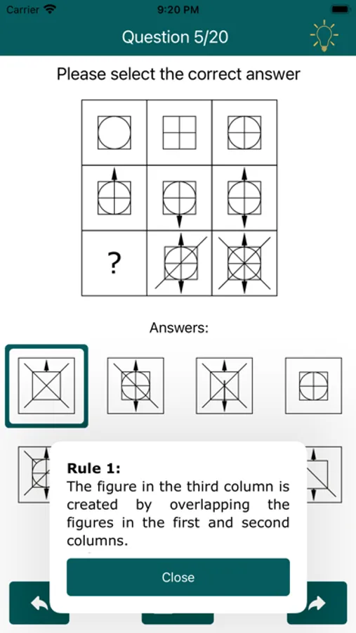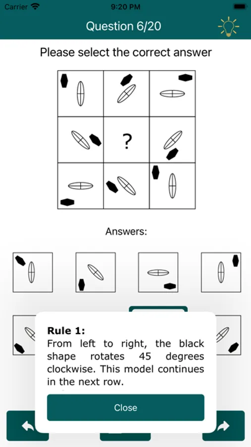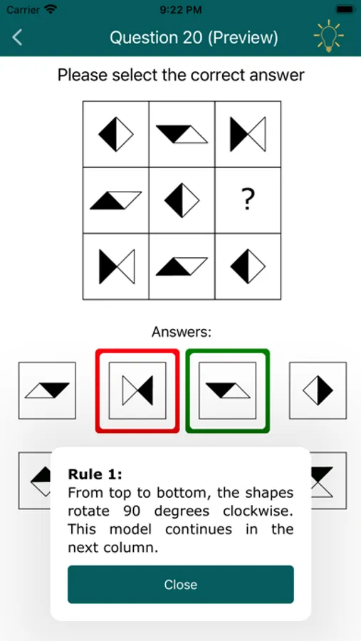 This app consists of total 100 multiple-choice RPM/SPM/APM questions. On each test you will get 20 random questions with similar difficulty. You will be given 8 choices from which to select and complete the missing element.