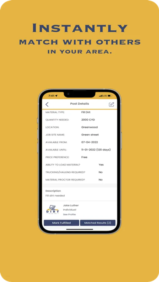Create a post in under a minute and search your area for job sites that have what you need to get your job done. Dirt Near Me will help you find the Export Sites, Fill Dirt, Crushed Stone, or Topsoil you need at a discount, make your bids more competitive, and make you more money!