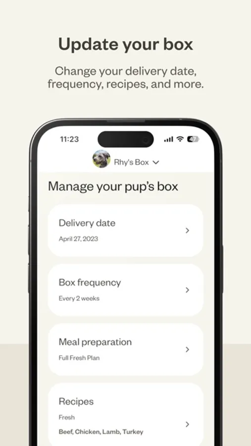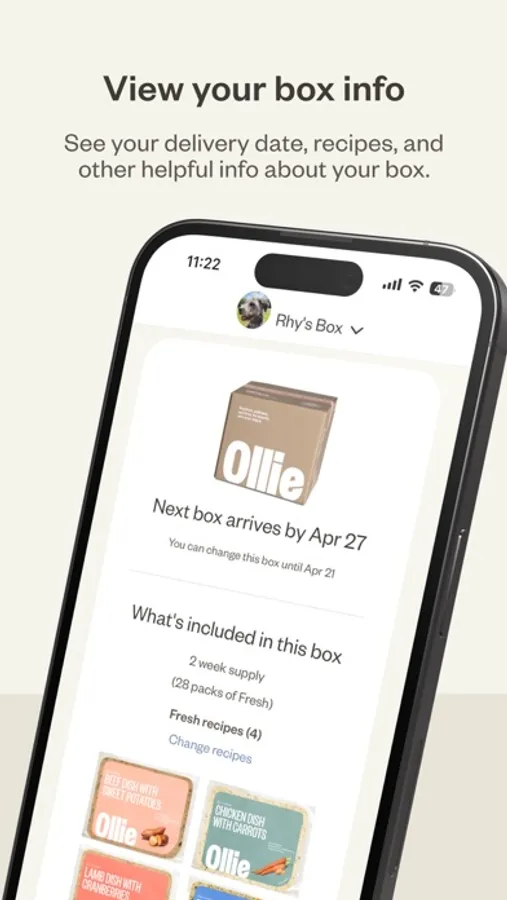 Easy access to your subscription so you can pick new recipes, change your delivery date, update your frequency, and handle everything else to do with your dog’s Ollie subscription.