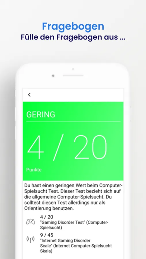 Der Medien- und Computerspielsucht-Test bietet einen kostenfreien Fragebogen, der in circa 15 Minuten mit unterschiedlichen Methoden genaue Informationen zu deiner Medien- und Computerspiel-Sucht bereitstellt. Nach Ende des Tests werden detaillierte Informationen zur Auswertung angegeben.