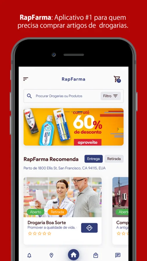 Encontre a drogaria ou farmácia mais próxima, faça seu pedido, escolha receber em seu endereço ou buscar no estabelecimento. Simples!