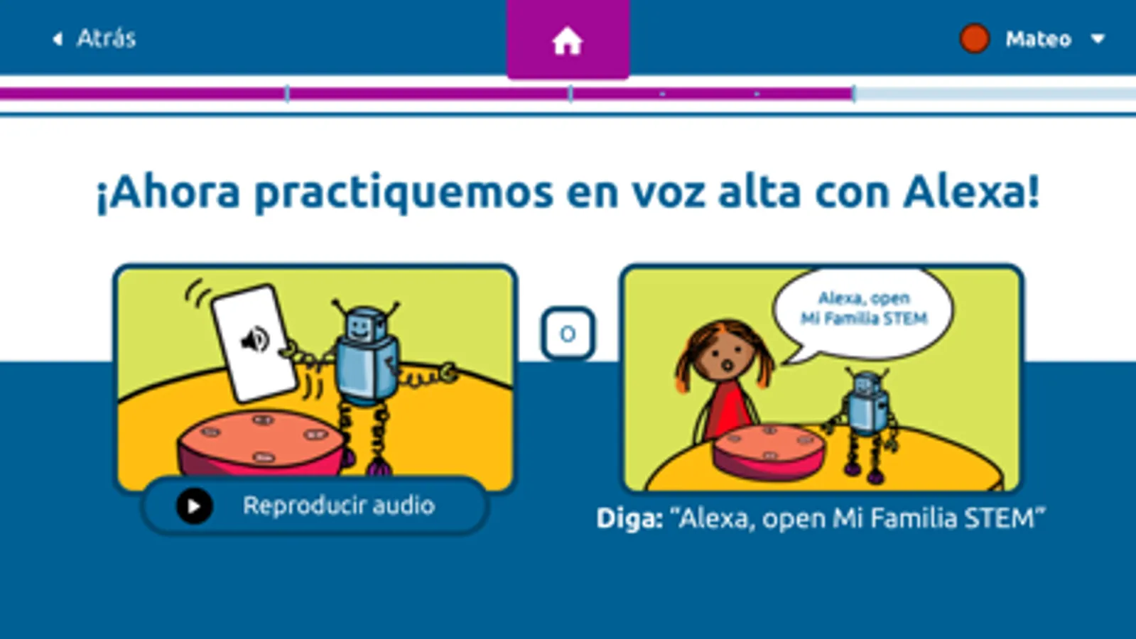 Mi Familia STEM is a dual-language, interactive, mobile app and Alexa smart-speaker skill that helps families learn new STEM words in English and Spanish. The app and skill include videos and short learning games.