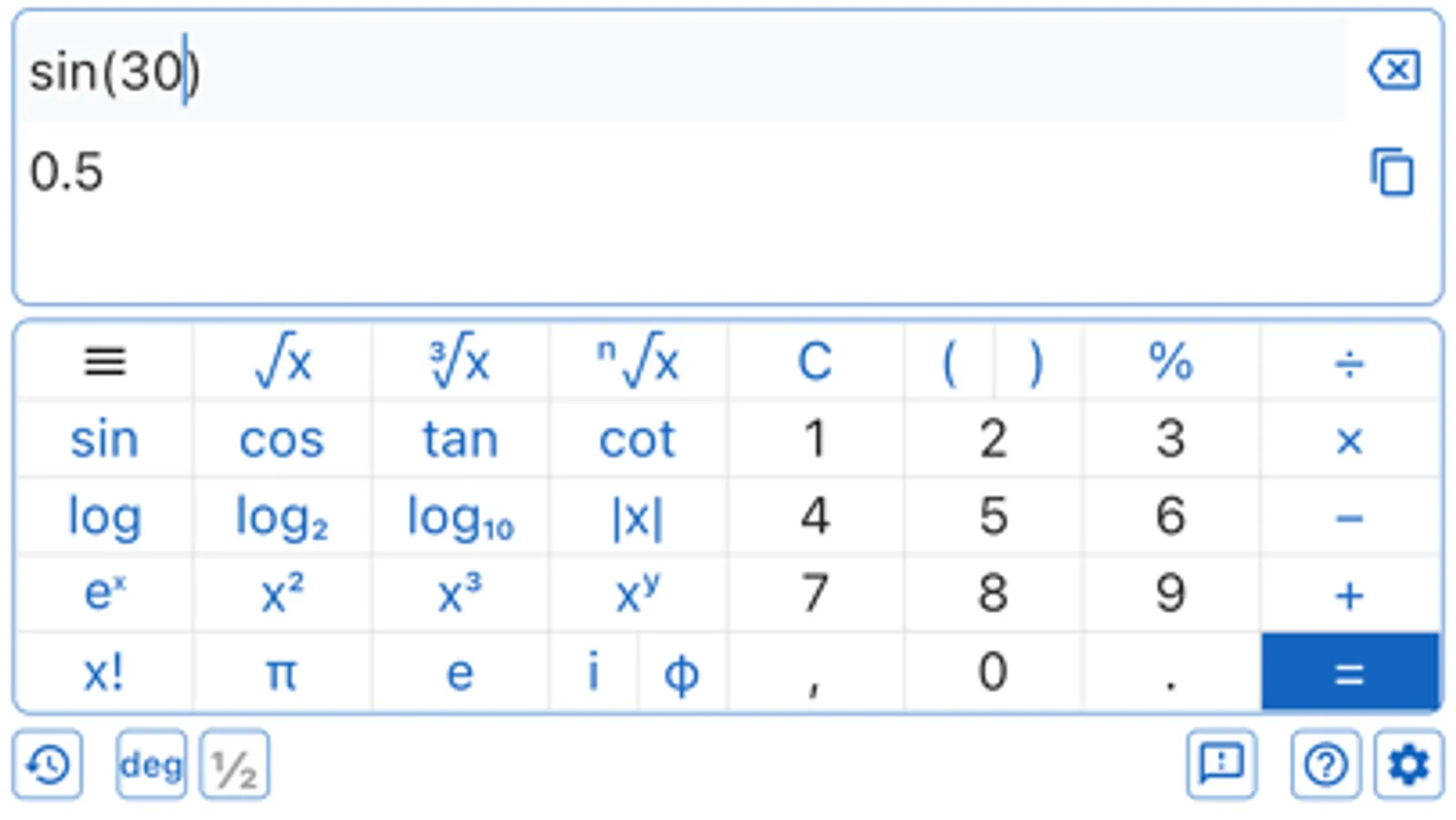 * Input for trigonometric functions can be in Degrees, Radians or Grads. You can choose input type by pressing 'Deg-Rad-Grd' button.