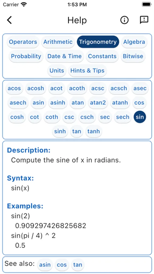 sin(0.5)^2+cos(0.5)^2, Result: '1' - trigonometric calculations.