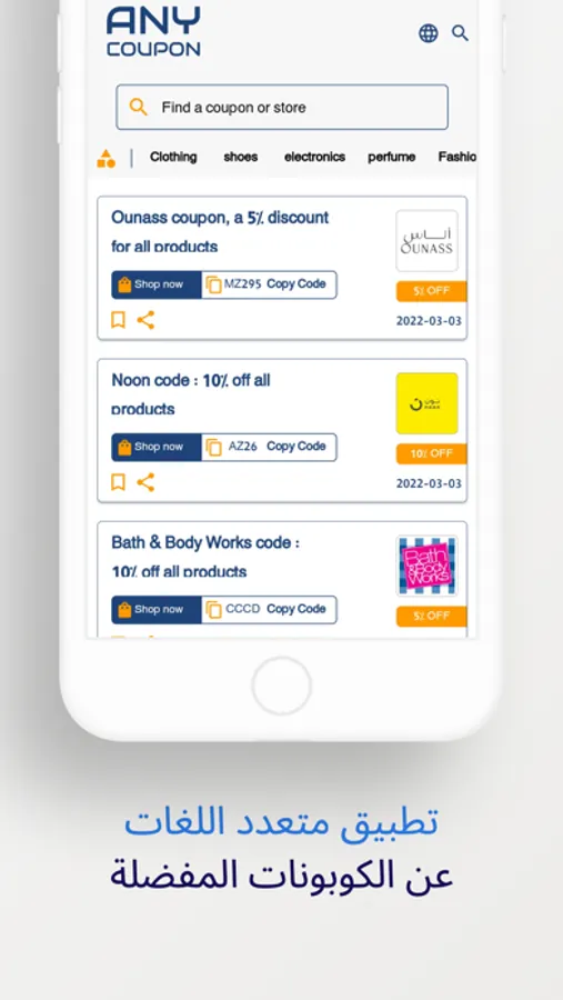 مع تطبيق any coupon بضغطه زر تحصل على جميع اكواد الخصم لتمتع بنسبه خصم تصل الى ٧٠٪ على اغلب مواقع التسوق الشهيره