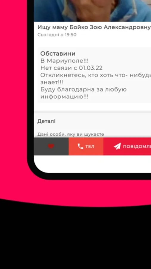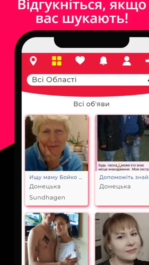 Так сталося, що війна призвела до того, що багато людей змушені були покинути рідні місця, залишити свої домівки і сьогодні знаходитись у різних місцях України та в різних країнах за кордоном. Наш додаток дасть можливість всім, хто сьогодні шукає своїх рідних, друзів, сусідів , знайомих розмістити свою інформацію і контакти для того, щоб в системі пошуку аплікації була змога знайти вас і вашу контактну інформацію.