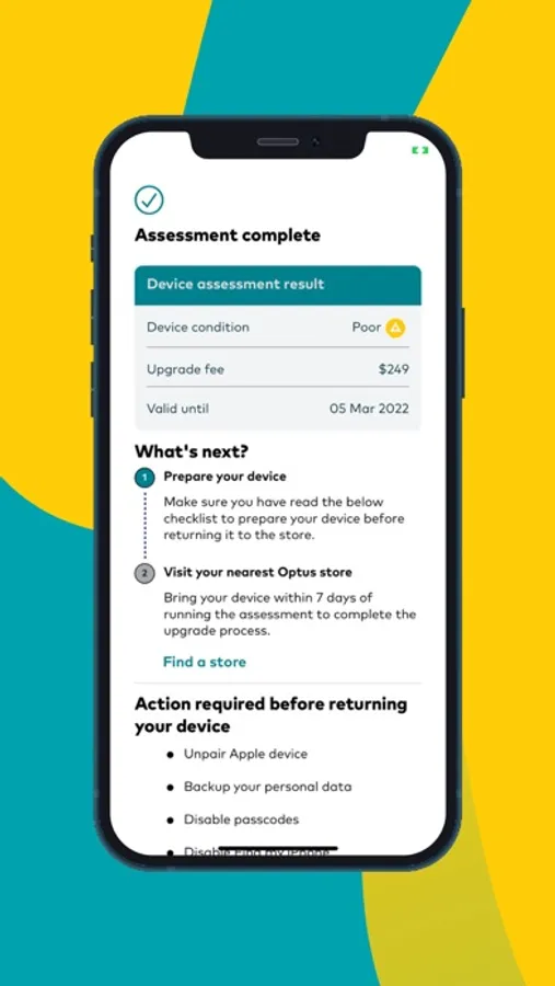 Download the Optus Device Upgrade app to assess your device for your Optus upgrade. If you are an Optus customer with [device upgrade], you can use this app to start the upgrade process. Follow the steps to perform an assessment of your device in as little as 2 minutes. You’ll answer a few short questions about the physical condition of your device and then the app will run diagnostic tests to determine your upgrade eligibility and cost.