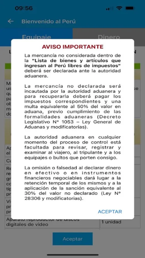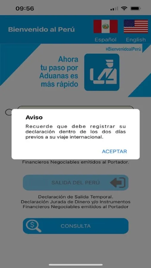 - “Declaración Jurada de Dinero”: Sólo si porta montos superiores a diez mil dólares americanos o su equivalente moneda nacional u otra moneda extranjera, sea en dinero o instrumentos financieros negociables emitidos al portador, a su ingreso o salida del Perú.