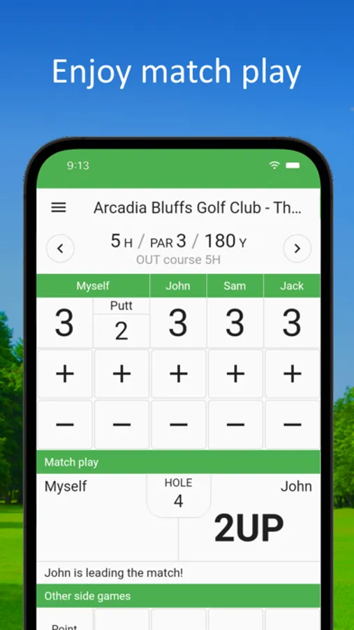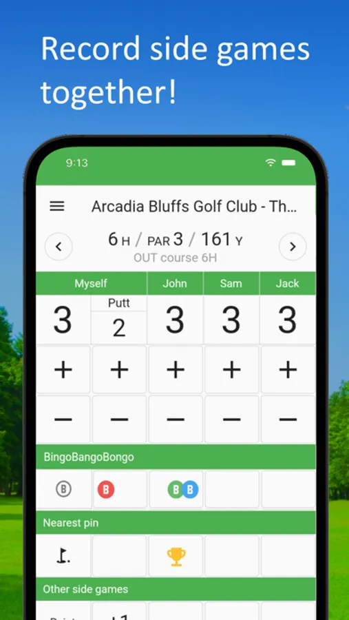 G score offers various side games, including Nearest to the Pin, Driving Contest, Matchplay, Olympic, Bing Bango Bongo, Fairways, and Greens!