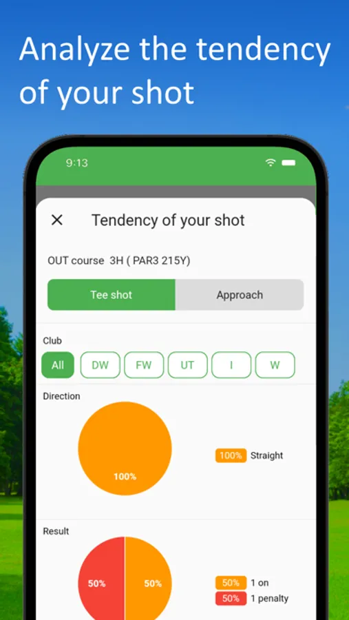 ◇ By adding additional details during score input, such as shot directions and impact, users can use graphs to analyze shot tendencies for tee shots and approaches.