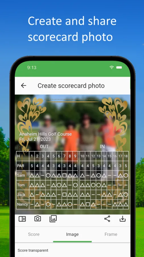 ◇ Users can create commemorative photos by adding score information, golf course names, and more to their favorite pictures. Furthermore, they can upload the created commemorative photos to social media to share them with friends.