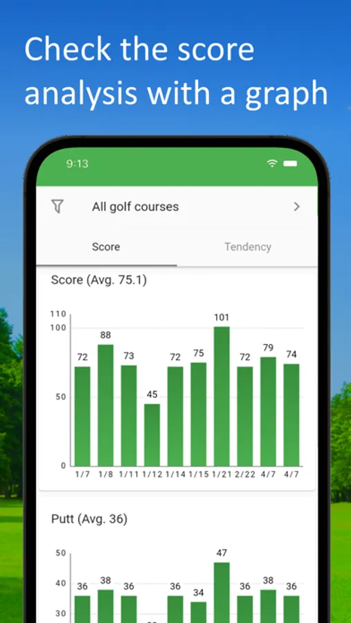 ◇ Graphs allow users to review the latest ten-round trends, including scores, putt numbers, score distribution, par-on percentage, and bogey-on percentage.