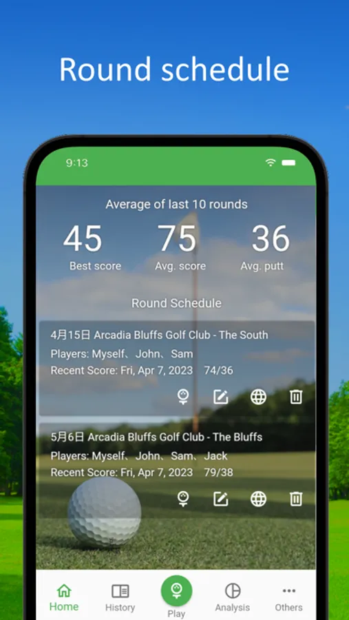 ◇ By inputting planned rounds, users can view golf course names, dates, start times, and members conveniently on the top screen, making it easy to check upcoming rounds. Additionally, simply tapping on a scheduled round initiates the round easily.