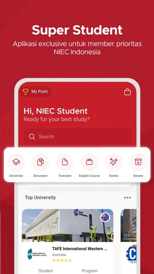 Super student membantu anak muda Indonesia untuk mewujudkan mimpi kuliah keluar negeri. Melalui apps ini, kalian akan mendapatkan berbagai macam service mulai dari: