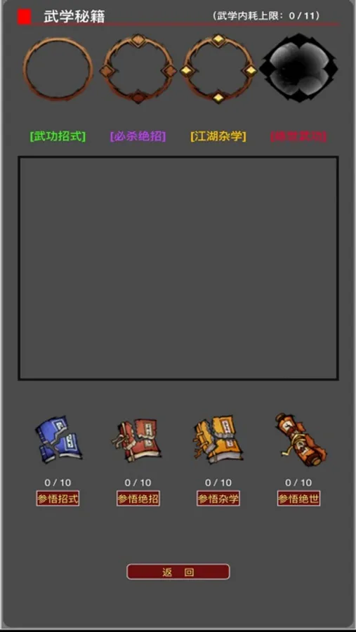 您将扮演一名初入江湖的小虾米,开始修习武功,寻找江湖中秘藏的各类武功秘籍,您可以修炼、进阶、突破各种秘传武功,体会到心法、拳法、腿法、剑法、刀法等武学的魅力,领会传统武学的精深。还可以在游戏中挑战各大门派,获得各类宝贝,体验锄强扶弱的快感,成为为国为民的侠之大者。您还能够不断地强化经脉、闭关聚气,不断提升自身战力,令自己在比武切磋中立于不败之地。为您还原一个江湖味十足的武侠世界。