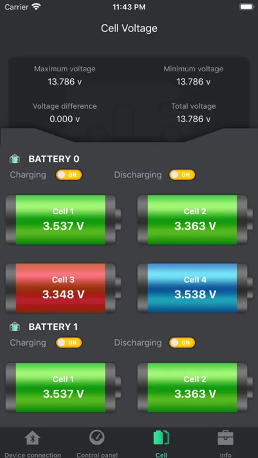 2. Display the real-time voltage and alarm status of all individual batteries. If the alarm or protection value is triggered, an alarm is generated.
