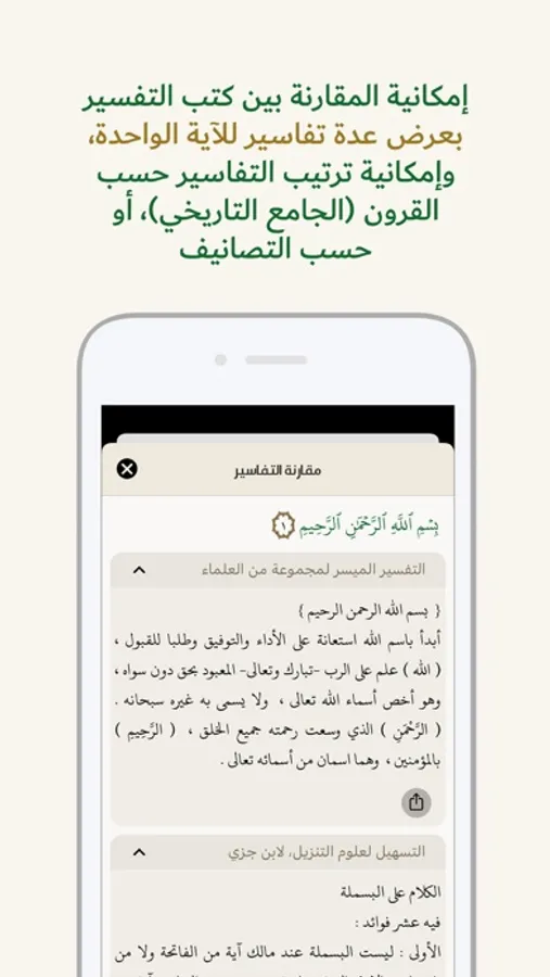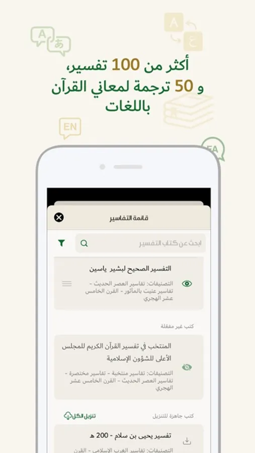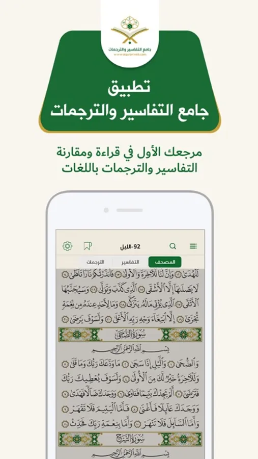 • إتاحة أكثر من 100 تفسير و 50 ترجمة باللغات.