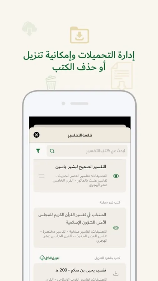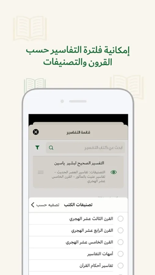 يتيح لك التطبيق استعراض أكثر من 100 كتاب من أمهات كتب التفسير، ومقارنة محتوياتها حسب السورة والآية، مع مجموعة من ترجمات معاني القرآن الكريم بأكثر من 50 لغة.